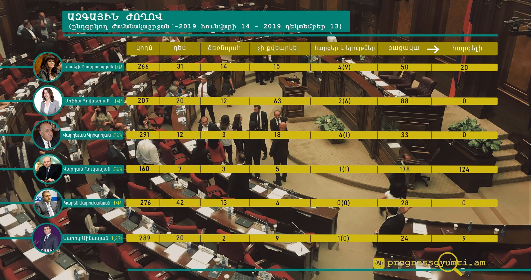 «Գյումրու Առաջընթաց» Քաղաքացիական Հասարակության Զարգացման Կենտրոն»-ի հարցմանն ի պատասխան ԱԺ աշխատակազմի ղեկավարի տեղակալ Լիլիթ Մինասյանի գրավոր տեղեկացրել է 14.01.2019 թվականից մինչեւ 13.12.2019 թվականը տեղի ունեցած նիստերի քվեարկություններին Շիրակի մարզից ընտրված 6 պատգամավորների մասնակցությունը` ըստ թվերի: